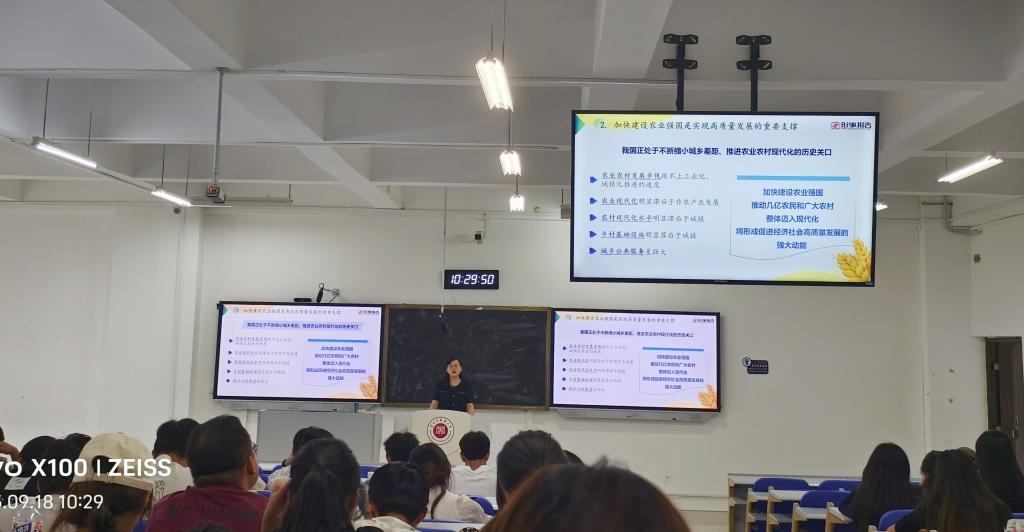 9月18日下午,贵州中医药大学校长周英教授以“阔步迈向建设农业强国”为主题,在花溪校区从正楼1-10教学楼为2022级应用心理班同学上形势与政策课。