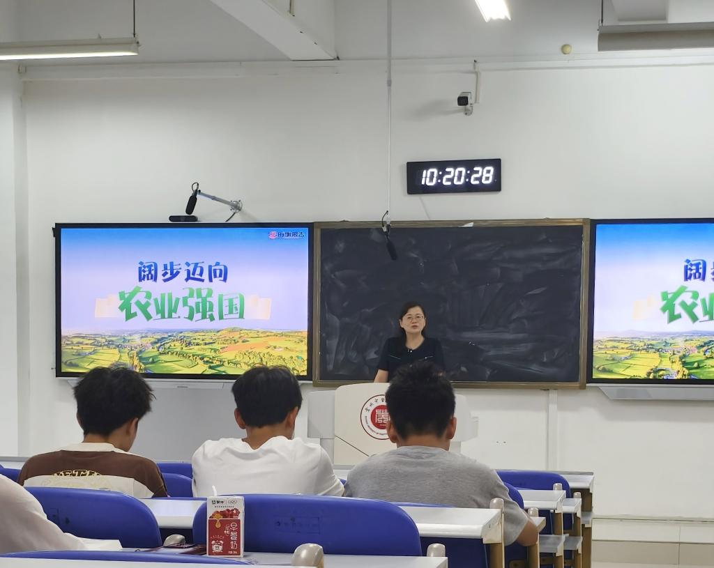 周英围绕为何要加快建设农业强国、要建设什么样的农业强国、要怎样加快建设农业强国这样三层逻辑给学生分析了建设农业强国的必要性和重要性。她强调,强国必先强农,农强方能强国,要建设的农业强国、实现农业现代化,青年学生应在建设农业强国中挺膺担当。她指出,青年学生是国家的未来、民族的希望,也是建设农业强国的生力军。要树立远大理想,胸怀“国之大者”,将个人成长与国家发展紧密结合起来。她希望同学们珍惜在校学习时光,努力学习专业知识,积极参加实践锻炼,提高解决实际问题的能力,为毕业后投身现代化强国建设打下坚实基础。同时勉励大家要始终牢记习近平总书记的殷切嘱托,以实际行动积极投身农业农村现代化建设的伟大实践,为全面推进乡村振兴作出积极的贡献。