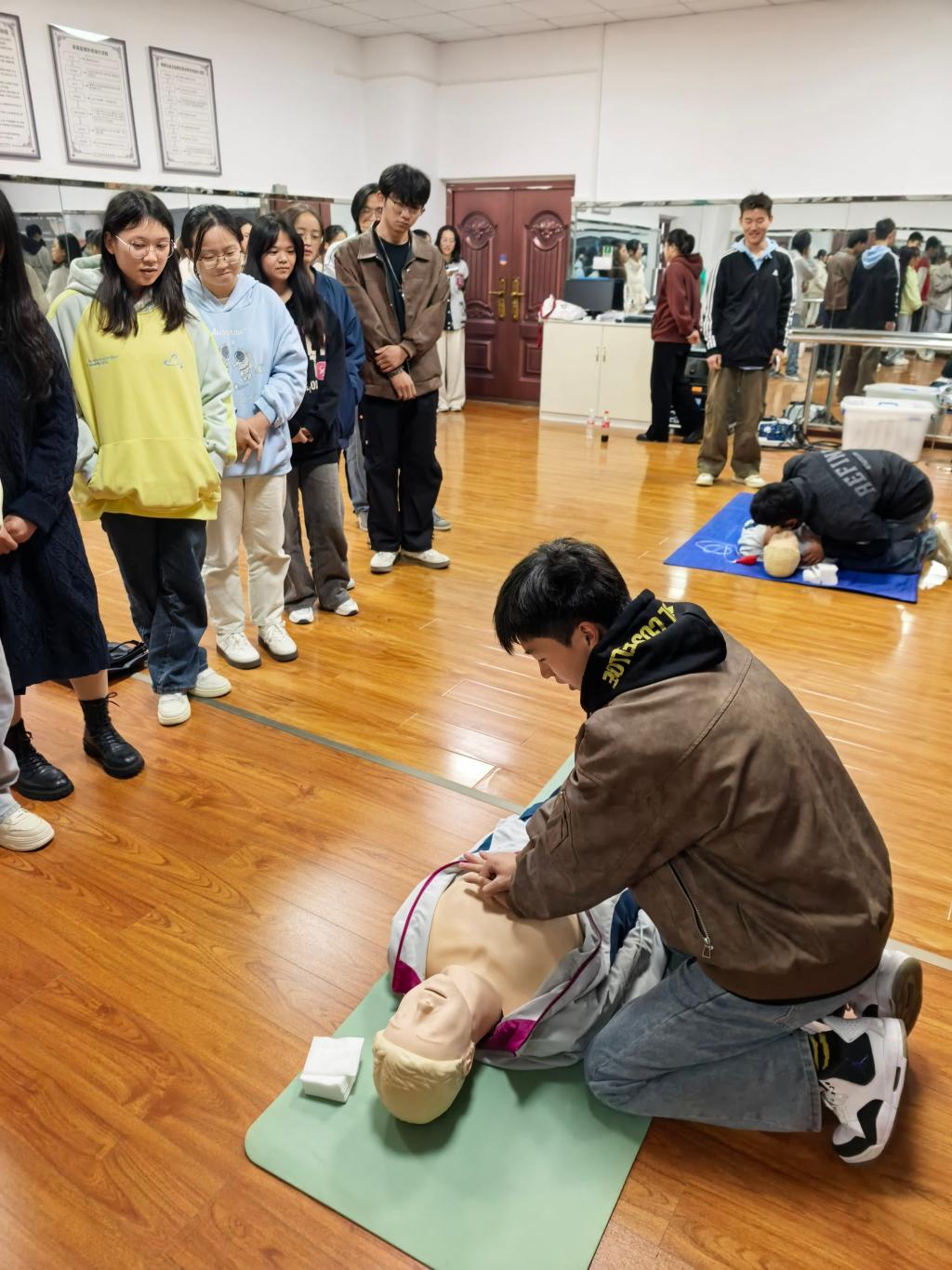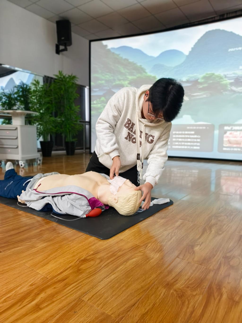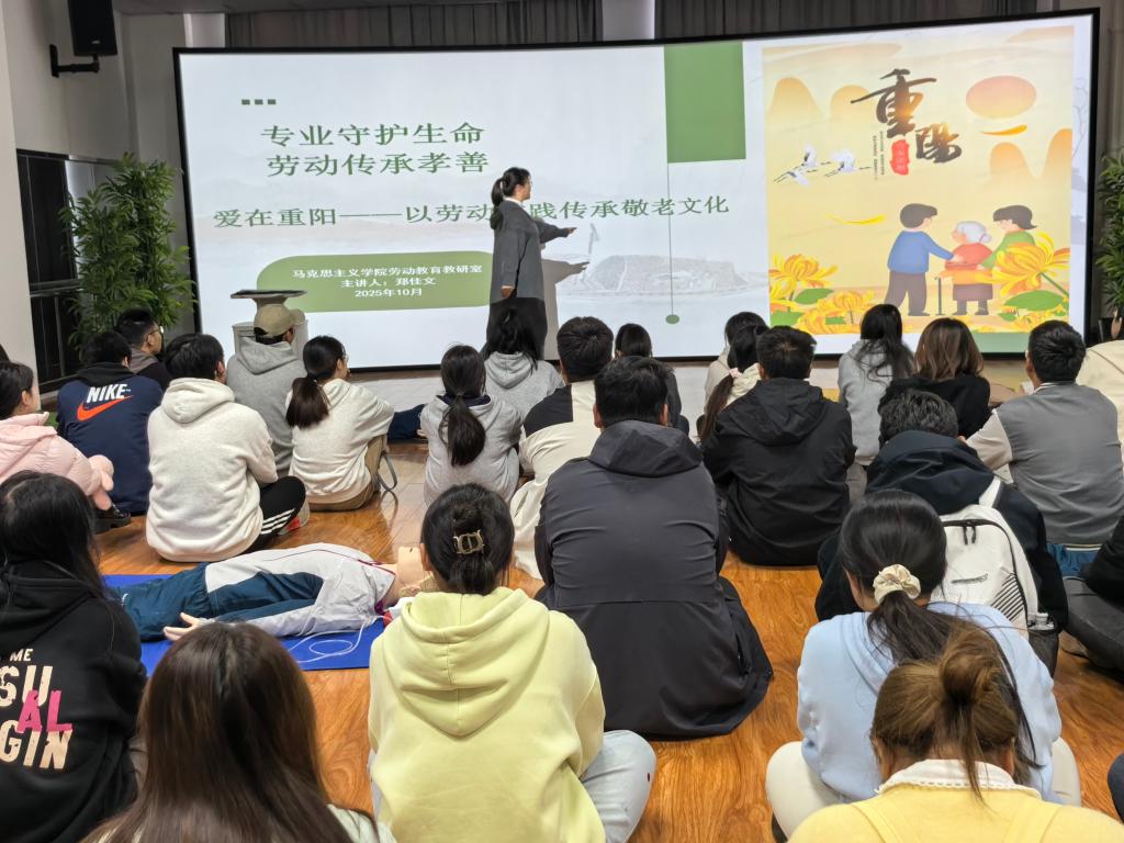 劳育教研室负责人郑佳文老师围绕“劳动教育与传统文化有机融合的路径”作专题讲授;护理学院程联凤老师结合老年人常见的心脑血管意外案例,就“心肺复苏(CPR)与高级着装式偏瘫护理模拟装置使用”进行深入讲授。通过理论讲解、动画演示、模型操作等步骤,强调“黄金4分钟”急救的重要性,特别示范了按压深度、呼吸频率的调整技巧,以及如何通过语言安抚稳定老年人情绪,将专业劳动、人文关怀融入实践教学。