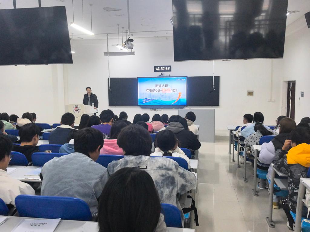 11月6日下午,贵州中医药大学党委常委、副校长刘震教授以“正确认识中国经济热点问题”为题,在思邈楼1-1教室为药学院食品质量与安全2025班讲授“形势与政策”课。