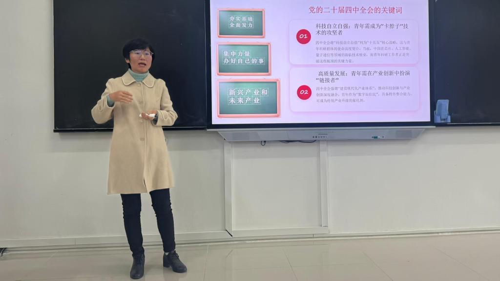 宣讲中,武晓丽从党的二十届四中全会审议通过的《中共中央关于制定国民经济和社会发展第十五个五年规划的建议》战略部署切入,向同学们解读全会要点,勉励同学们锚定“十五五”发展目标,将个人成长融入国家现代化建设,以全会精神为指引,在实践中践行使命、成长成才。