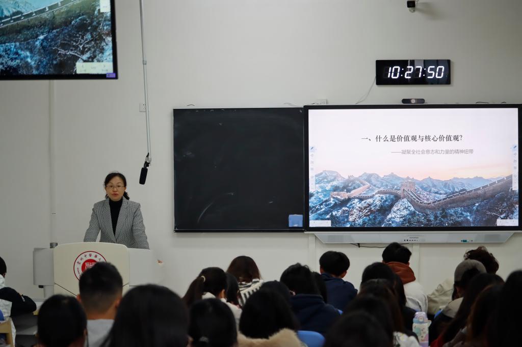 课程伊始,明雪梅围绕主题,从理论与实践、历史与现实相结合的角度,进行了深入浅出的阐述,她指出,大学阶段是青年学生思想观念形成和确立的关键时期,学习这门课程,对于提升思想道德素养、法治意识,明确时代责任与历史使命具有不可替代的作用。她强调,社会主义核心价值观是当代中国精神的集中体现,凝结着全体人民共同的价值追求,是凝聚人心、汇聚民力的强大力量。她鼓励同学们要将社会主义核心价值观内化于心、外化于行。作为新时代的大学生,要自觉加强理论学习和道德修养,从小事做起,从身边事做起,在日常学习、生活和未来的社会实践中,勤学、修德、明辨、笃实,努力成为社会主义核心价值观的坚定信仰者、积极传播者和模范践行者。