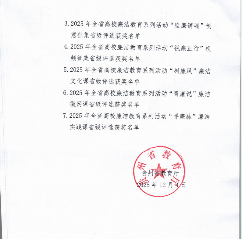 近日,贵州省教育厅公布2025年全省高校廉洁教育系列活动获奖名单中,我院韦伟、庞雯予、龚雪敏、文远冬等老师作品《思韵廉风——廉洁文化小课堂》在“树廉风”廉洁文化课项目中荣获二等奖。